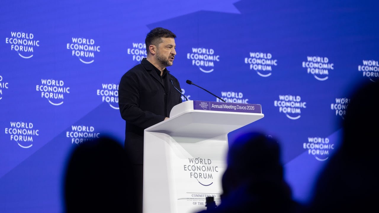 Владимир Зеленский выступает на Всемирном экономическом форуме в Давосе, 22 января 2026. Кадр видео